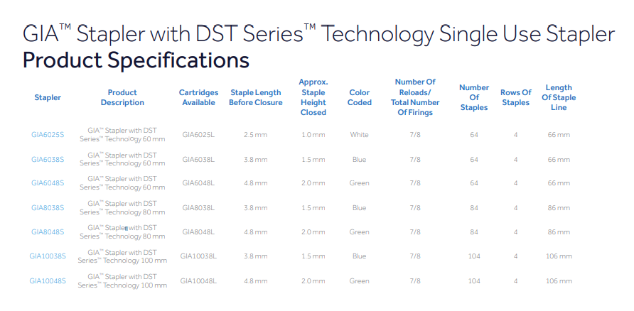 재장전 가능한 스테이플러는 다양한 조직 두께를 수용할 수 있도록 세 가지 주요 크기로 제공된다.