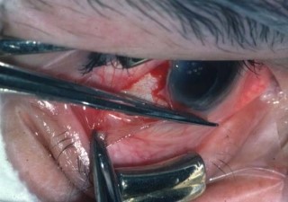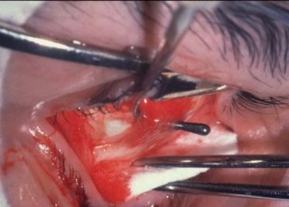 eye speculum 으로 벌린 후 tooth + wescott's scs로 cunjuctive 를 분리