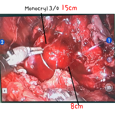 bladder neck쪽이 wide하게 잘렸다면 입구를 좁혀주기 위해 2/0 vicryl (15cm) , 2/0 vicryl 로 넣어주어 suture