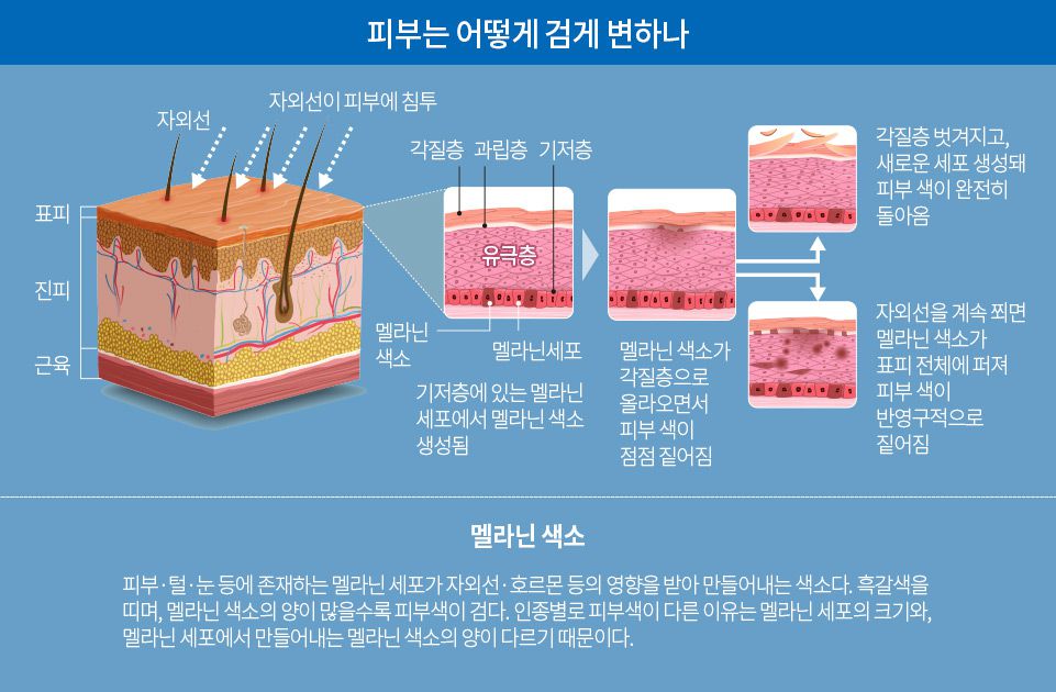 멜라닌 색소는 우리 몸을 자외선으로부터 보호하기 위해 피부 내에서 만들어지는 물질이다. 적절한 양이 존재 할 때 건강한 피부가 유지되지만, 과다하게 생성된 후 배설이 원활히 이루어지지 않으면 피부 내 색소가 침착된다. 자외선으로서 햇빛을 받으면 멜라닌(melanin) 색소를 만드는 세포인 멜라닌세포(melanocyte)가 활발하게 멜라닌 색소를 만들기 때문에 나타나는 것으로 알려져 있다. 그 외에도 임신, 경구 피임약 등에 의해서도 생길 수 있다. 피부 색소 침착증은 기미(흑피증), 주근깨, 노인성 검은 반점(검버섯) 등으로 매우 다양하다.