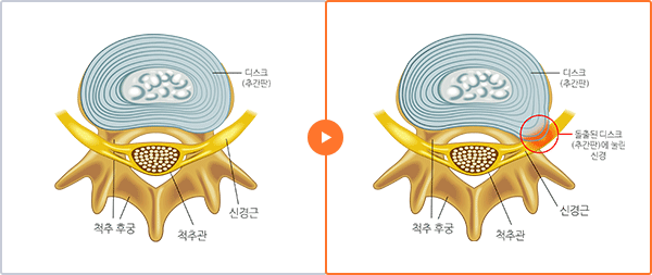 ㆍ 척추사이의 디스크가 척추관쪽으로 뒤로 밀려나거나 탈출되는 경우