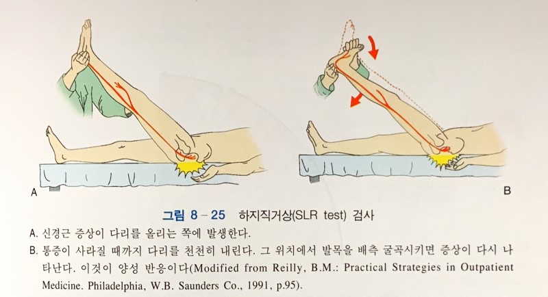 (1) 하지 직거상 검사(straight leg rasising(SLR) test) :