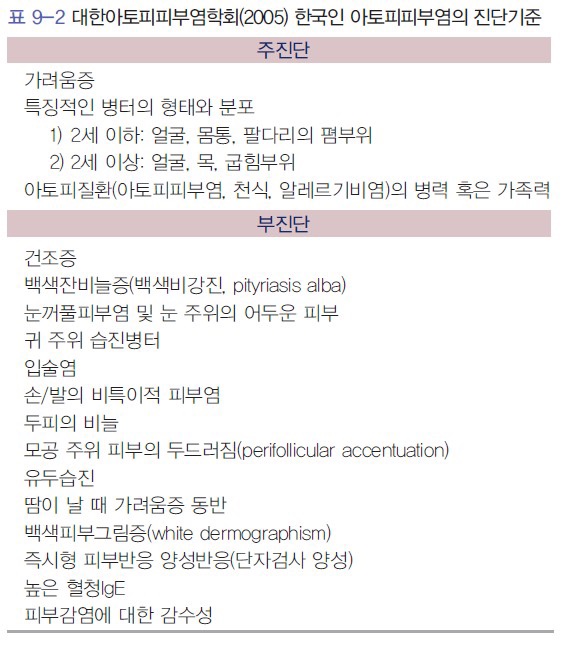 아토피 피부염은 특징적인 피부 증상으로 인해 내원해서 신체 검진과 사정 (병력, 가족력) 을 통해 아토피 피부염을 진단한다. 대한 아토피 피부염 학회에서 한국인 아토피피부염의 진단기준은 3가지 주진단기준 소견 중 적어도 2개 이상, 14가지 보조진단기준 소견 중 4가지 이상 속할 경우 진단을 내린다.