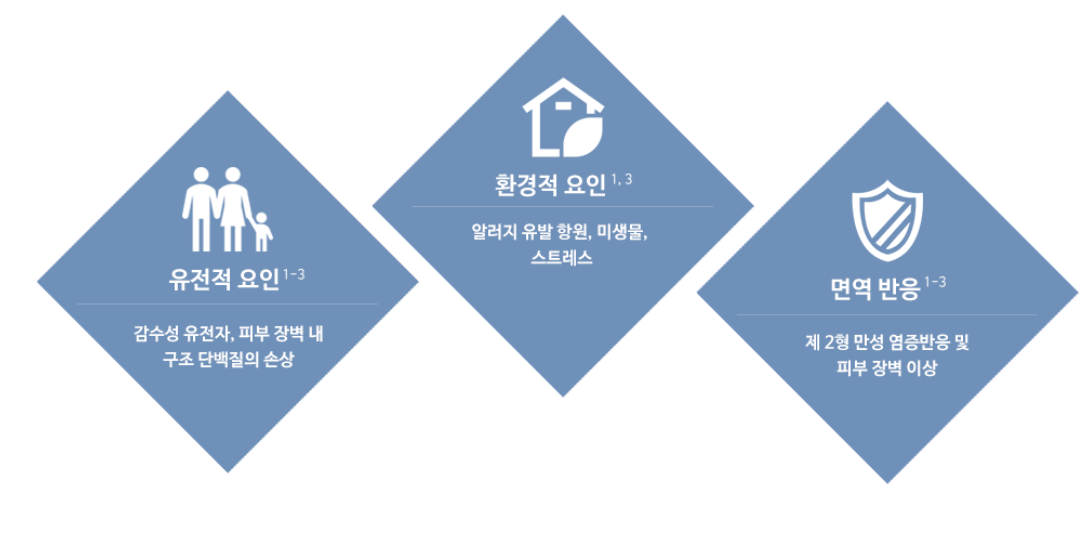 아토피피부염은 유전학적 측면, 면역학적 측면, 피부장벽기능, 환경요인 등의 복잡한 상호작용의 결과로 발생한다. 아토피피부염 환자의 70-80%에게 아토피질환의 가족력을 확인할 수 있는 만큼 아토피피부염은 유전적인 소인이 중요한 질환이다. 여러 유전자가 아토피피부염 발생에 관여하며 다양한 민족을 대상으로 한 연구에서 피부장벽 기능, 표피분화, 면역반응과 연관된 유전자의 변이가 보고되고있다. 피부 장벽 손상, 면역 반응의 결함 (T세포의 기능이상, 항균펩티드저하 등) 으로 인해 세균, 바이러스, 진균 등의 피부염이 아토피피부염 환자에서 정상인보다 높은 빈도로 발생한다.