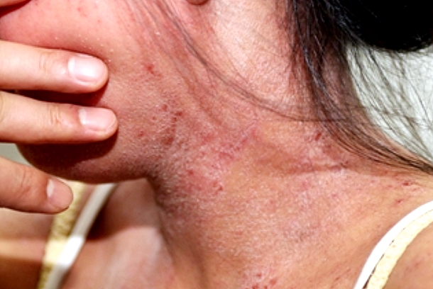 무증상의 피부염, 어린이의 뺨이나 윗팔, 몸통에 경계가 불분명하고 색이 별로 없으며, 비늘처럼 벗겨지는 반점모양