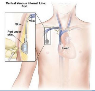 암을 치료하는 방법 중 항암 화학 요법 중 정맥 혈관을 통해 약물이 주입된다. 장기간 항암 화학 요법을 받는 환자들의 경우에는 혈관이 굳어져서 주사 바늘이 들어갈 수 없거나, 정맥 혈관이 잘 보이지 않거나 통증을 동반 할 수 있기 때문에 중심 정맥에 관(카테터)를 삽입하여 유지시켜놓는다.