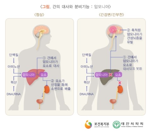암모니아는 아미노산과 핵산의 주 대사산물이다. 암모니아를 요소로 전환시키는 요소회로(Urea cycle)의 주요 효소들이 간세포에만 존재한다. 암모니아는 간에서만 대사된다. 간경변(LC) 또는 급성 전격간부전 등에 의해 간의 대부분이 파괴되면, 요소회로의 효소들이 고갈된다. 암모니아 검사는 간성혼수, 간뇌증후군 등의 진단과 치료 관찰에 이용된다.