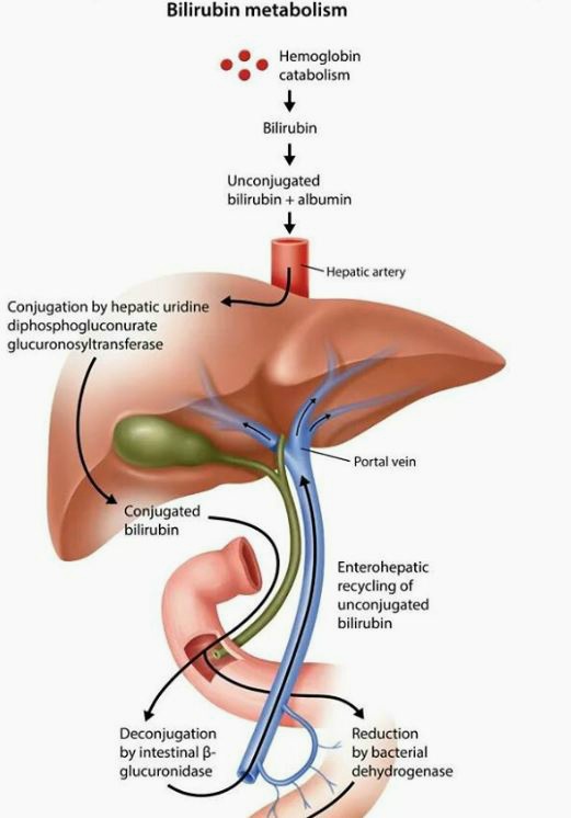 빌리루빈 (bilirubin)은 철결합 생소성분인 헴(heme)의 대사 산물이다. 적혈구가 120일 지나면 기능을 다하고 분해된다. 이때 적혈구의 구성 성분 중 하나인 혈색소가 비결합 빌리루빈 형태로 분해되게 된다. 비장(spleen) 등지에서 비결합 빌리루빈이 만들어지면 간으로 전달되고 간에서 담즙의 형태로 분비되어 간세포에서 담즙의 형태로 바뀌어 담낭에 저장되어 있다가 십이지장으로 배출된다. 소장에서 박테리아에 의해 분해되어 결국 대변으로 배출된다. 빌리루빈의 색에 의해 대변이 갈색을 띄게 되고, 신장을 통해 소변으로 배출되기도 한다.