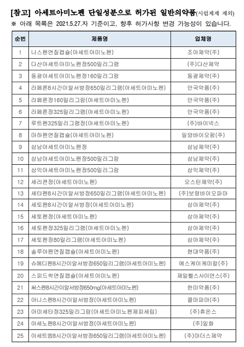 식약처로부터 허가받은 아세트아미노펜의 제제의 일반의약품은 70여개나 될 만큼 종류가 많다. 꼭 타이레놀을 먹을필요 없이 코로나19 백신 접종 후에 복용할 아세트아미노펜 단일제재를 복용하면 된다. 우리나라 식품의약품안전처는 오리지널 의약품과 안전성·유효성 측면에서 동등하다는 객관적 시험을 통과해야만 복제 의약품 (제네릭 의약품)으로 인정하고 있다. 우리나라 식품의약품안전처의 제네릭 허가 기준은 미국, 유럽, 일본 등 전 세계가 공통으로 사용하는 제네릭 허가 기준이다. 제네릭의약품은 국제적 기준인 생물학적동등성시험을 통과해야 허가를 득할 수 있다. 약물의 흡수량 및 흡수속도가 오리지널의약품과 동등함을 확인하는 시험을 말하는데 정확성, 민감도, 재현성이 우수하여 입증하는 방법으로 권장하고 있다. 전 세계가 오리지널 의약품(100)을 기준으로 할 때, 제네릭의 안전성·유효성 범위가 80~120%를 충족하는 것이다. 80~120%이면 오차범위가 너무 넓다고 생각할 수 있으나 절대 그렇지 않다. 이는 전 세계 의약전문가들이 과학적 근거에 기반해 결정한 '오리지널 의약품과 제네릭 의약품이 동등하다고 인정하는 범위'다.