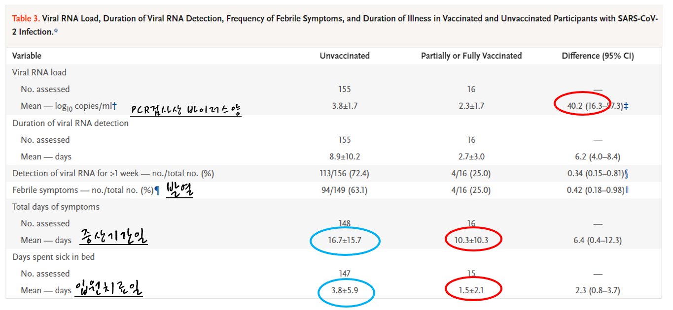 공동 연구팀은 mRNA 백신이 만약 확진되더라도 증상을 약화시킨다고 봤다. 실제로 코로나19 확진자 중 백신 미접종자는 평균 16.7일 동안 코로나19 관련 증상을 겪은 반면 접종자는 10.3일로 6.4일 더 짧았다. 입원 치료를 받은 기간도 접종자가 평균 1.5일로 미접종자의 경우는 3.8일로 접종자의 경우 2.3일 짧았다. 코로나19로 인해 38도 이상 발열 증상을 겪을 확률도 백신 접종자가 미접종자보다 58% 낮았다. 또한 mRNA 백신은 코로나 바이러스의 활성 정도를 떨어트렸다. PCR 검사 결과 백신 접종자에서 검출되는 바이러스 양이 미접종자보다 40%나 적었다. 미접종자는 확진 후 평균 2주 이상 바이러스가 검출됐지만 접종자는 그 기간이 평균 1주일로 절반 이상 줄었다.
