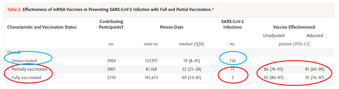 지난해 12월부터 올해 4월까지 보건 기간 중 1번이라도 백신을 접종한 의료종사자 3179명 가운데 코로나 19명 감염된 사례는 1차 접종시에 11명, 2차 접종시에 5명으로 총 16건으로 보고되었다. 1차로 접종을 완료한 경우 81%, 2차 접종을 마칠 경우 91%의 예방효과를 보인다. 반대로 백신 접종을 받지 않는 796명 가운데 156명이 확진 판정을 받았다.