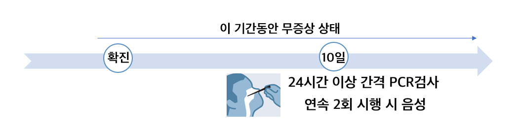 확진 후 무증상 상태 지속되어 검사결과 확인 시까지 임상증상이 계속 발생하지 않고 PCR 검사 연속 2회 음성으로 확인되면 2차 검사 음성 확인 시점 이후 격리해제 가능