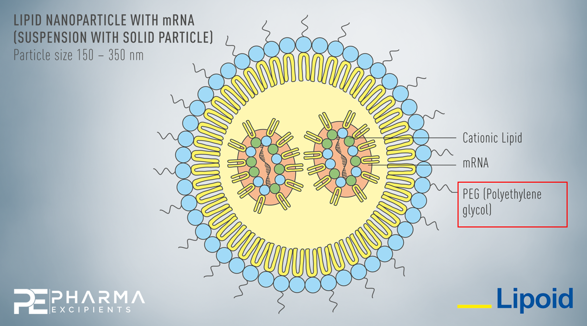 mRNA 코로나 백신인 화이자와 모더나 백신과 관련된 아나필락시스의 부작용은 지방 나노입자의 성분이 PEG (폴리에틸렌 글리콜 폴리머)로 쌓여있는데 이 물질에서 아나필락시스 반응이 나타나는것으로 의심하고 있다. PEG의 경우 친수성이 높아 하이드로겔 등의 드레싱 제제, 각종 로션, 크림 등의 화장품, 경구 약제의 코팅제, 초음파용 젤, 항암제 등 다양한 분야에서 사용되고 있다. 이렇게 우리 주위에서 한번쯤 노출하는 물질이다보니 많은 사람들이 자연스럽게 사람들이 항체를 가지고 있다. 보고에 의하면 일반인의 70% 가 PEG 항체를 갖고 있다고 알려져 있다.