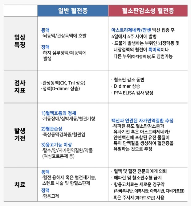 결론적으로 말하면 백신을 접종 받은 여성과 피임약을 복용한 여성 모두 혈전을 경험할 가능성이 있지만, 두 혈전의 경우 유형이 전혀 다르다. 아스트라제네카와 얀센 백신 접종 후 나타난 혈전증은 혈소판 감소가 동반되지만, 피임약을 복용한 여성들에게 나타나는 혈전증은 혈소판 감소 증상이 함께 나타나지 않는다. 백신은 혈소판에 대한 항체를 활성화시켜 혈소판을 응집심킴으로써 뇌정맥동, 내장정맥에 혈전을 유발시킨다.