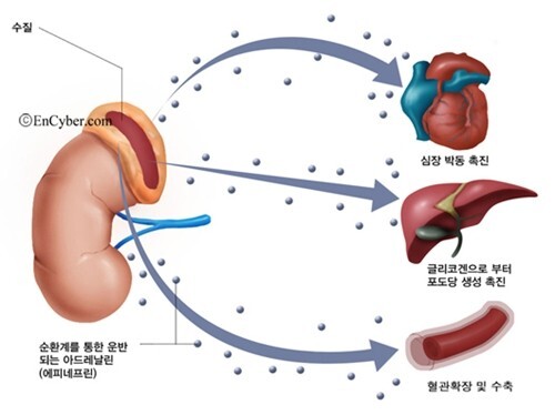 - 심근 수축을 자극하며 심박수,혈압과 호흡수 증가 시킨다.
