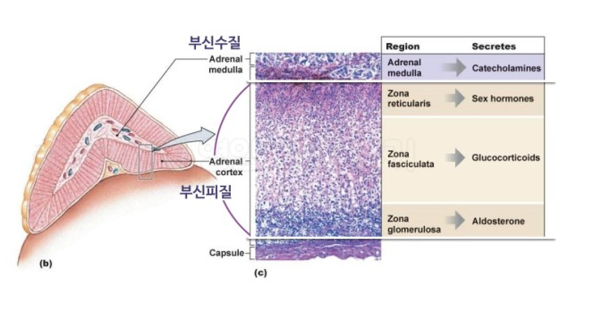 세 층으로 나뉘며 대사와 면역에 반드시 필요한 호르몬을 분비한다