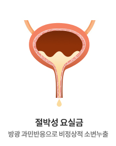 갑작스럽게 소변이 마렵고 이로 인해 소변을 참지 못하고 소변을 흘리는 것으로, 빨리 화장실에 가지 않으면 소변이 새서 속옷을 적시거나 화장실에서 속옷을 내리면서 소변이 새어 나온다.