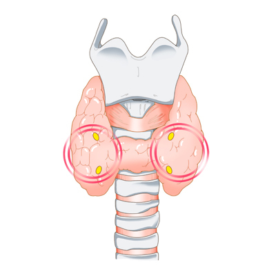 갑상선 주위에는 성대로 들어가는 신경들이 분포하고 있으며 갑상선암의 신경 침범이나 정상과 다른 특이 해부학적 신경주행이 있는 경우 신경손상이 올 수 있다. 이중 상부 후두 신경이 저하되면 목소리가 쉬게 되며, 양측이 모두 마비될 경우에는 기도가 막혀 숨을 쉴 수 없게 되어 기관지 절개를 시행해야 할 수도 있다. 따라서 병변이 신경에 붙어 있는 경우에는 신경손상의 가능성이 있으며, 때에 따라서는 완치를 위해 신경을 함께 절단해야 하는 경우가 있다.