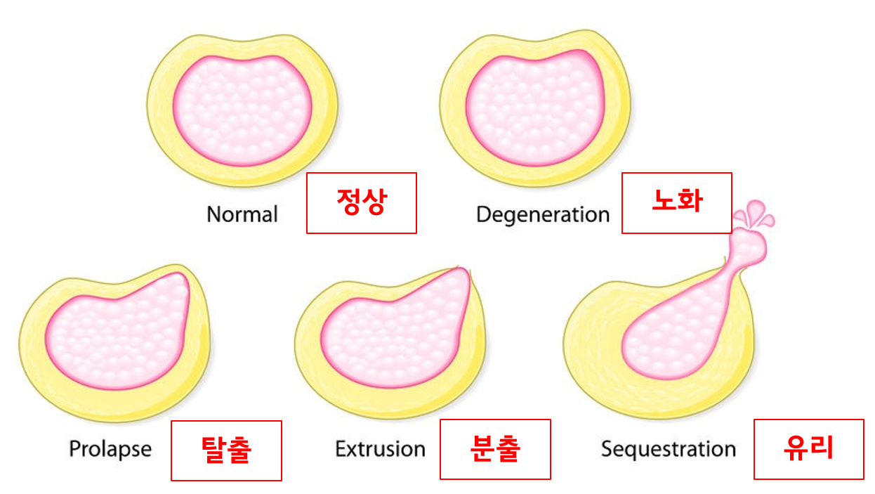 수핵은 나이가 증가함에 따라 수분이 감소하여 퇴행성 변화를 일으켜 탄력성이 상실되어 굳어지고 섬유륜은 부분적으로 갈라지면서 약해져 과다한 하중이 가해지면 굳어진 수핵이 약해진 섬유륜을 밀고 돌출되거나, 섬유륜을 뚫고 수핵 일부가 밖으로 빠져나가 척수나 신경근(nerve root) 을 압박한다. 섬유륜의 후방은 좁고 엷은 후종인대가 중앙부만 싸고 있기 때문에 수핵은 섬유륜의 후측방 또는 후중앙으로 쉽게 탈출되어 인접한 신경을 압박하여 증상을 일으키게 된다.
