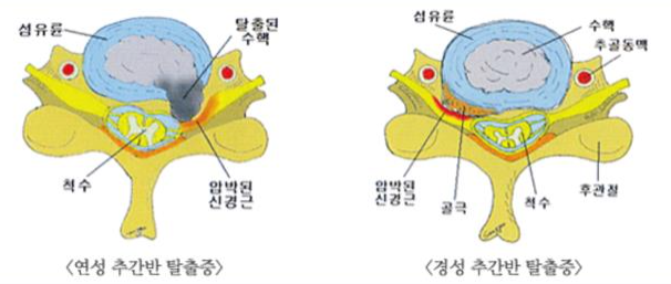 - 디스크 내의 수핵이 터져나와 신경을 압박하는 질환