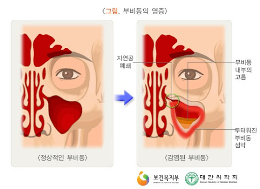 부비동은 작은 구멍을 통해 콧 속과 연결된다. 이를 통해 콧 속이 환기되고 부비동 내의 분비물이 자연스럽게 콧 속으로 배출된다. 부비동염은 이 부비동에 염증이 발생하여 콧물이 배출되지 못하고 고여 있는 상태를 말한다.