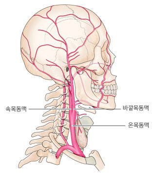 경동맥이란 심장에서 나온 대동맥에서 머리로 혈액을 보내는 주요한 혈관을 의미합니다. 대동맥궁에서 나온 총경동맥(온목동맥)은 외경동맥(바깥쪽동맥)과 내경동맥(속목동맥)으로 나뉘어진다.