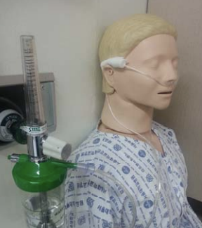 6) 비강캐뉼라와 산소유량계를 연결한 후 지시된 용량으로 유량을 조절하여 산소가 나오는지 확인한다.