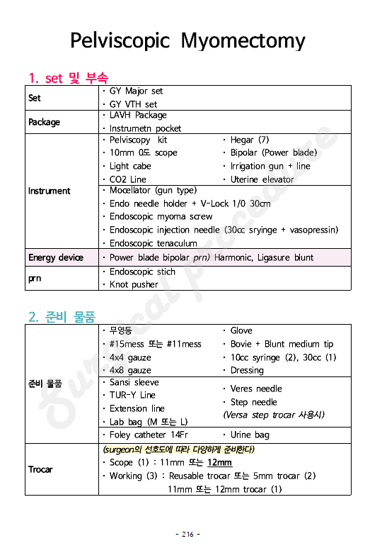 | Instrument | ・ Pelviscopy kit ・ 10mm 0도 scope ・ Light cabe ・ CO2 Line |